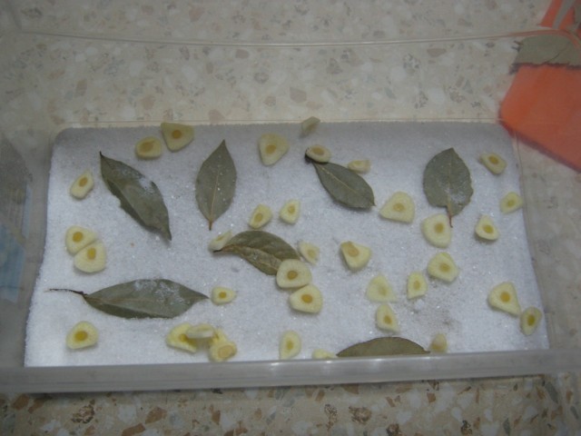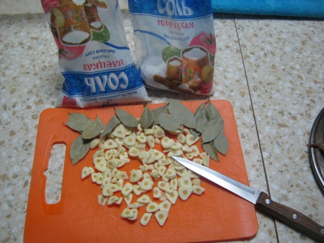 Готовим чеснок, соль, лавровый лист (соль в пакетиках стоит - как Инь-Янь получилось)