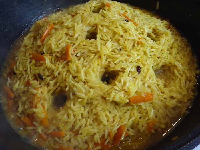 Крышкой я не накрываю, просто разравниваю рис и жду, пока он не впитает всю воду. Как только на поверхности воды не осталось, формируем из риса горку в центре казана, и проделываем дырочки, чтобы по краям и внутри оставшаяся вода быстрее испарилась.