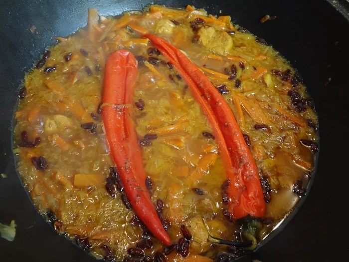 Через какое-то время марковка размякнет и станет ломкой - можно заливать всё кипятком, добавлять специи, соль, острый перец. Важно, чтобы перец во время варки был целым, нам нужен только его аромат, иначе плов будет слишком острым. Этот потрясающий бульон называется Зирвак (если кто не знал вдруг). Зирвак необходимо накрыть крышкой на 30 минут и убавить огонь до среднего. Это позволит насытить бульон потрясающим ароматом специй, мяса и овощей, что в дальнейшем обогатит невероятным вкусом наш рис.