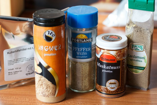 специи тщательно взвешиваем, от этого сильно зависит конечный вкус продукта. моя жена не любитель белого перца, и сразу меня спалила, всего лишь откусив один кусочек. а там всего то 3 грамма.