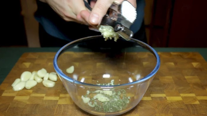 Приготовление ноги барашка я начинаю с маринада. Снимаем иголки с веточек розмарина. Аккуратно складываем их вместе и мелко нарезаем. Перекладываем нарезанный розмарин в глубокую емкость. Головку чеснока разбираем на зубчики и очищаем каждый зубчик от шелухи. Весь чеснок пропускаем через пресс для чеснока в миску к розмарину.
