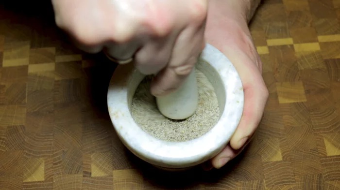 Перейдём к приготовлению смеси специй. Для этого помещаем в ступку 2ч.л. кориандра, 2ч.л. черного перца горошком, 0.5 ч.л. зиры, а также 3 ч.л. соли. Перетираем содержимое ступки до однородного состояния. Перекладываем измельченные специи в ёмкость к розмарину и чесноку. Добавляем растительное масло.