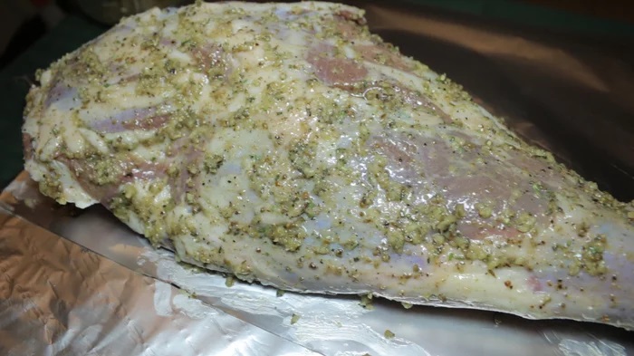 Промываем баранью ногу. Вытираем её насухо бумажными полотенцами. На рабочую поверхность выкладываем фольгу в несколько слоёв. Помещаем ногу на фольгу. Наносим на неё маринад. Заворачиваем ногу в фольгу. Оставляем ногу мариноваться в холодильнике на 8 часов. Если вы сможете оставить её на более продолжительный срок, то от этого она станет только вкуснее.