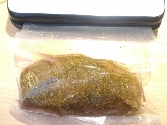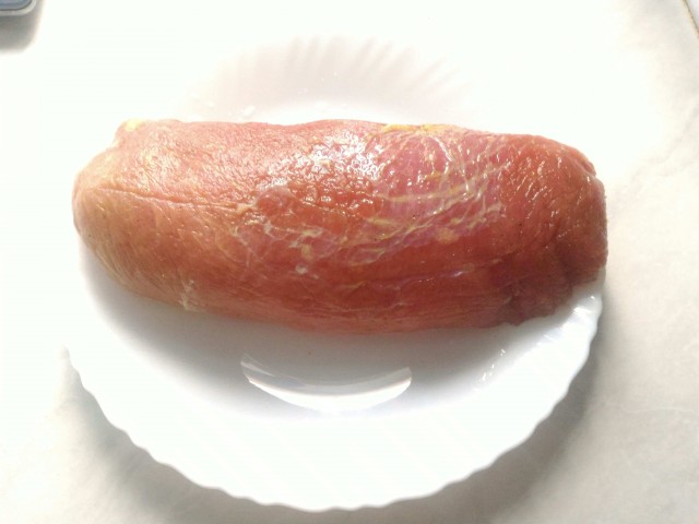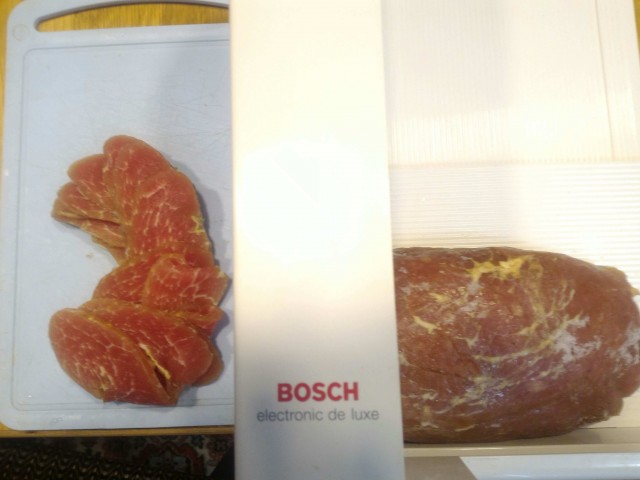 Ну вот, вспомнил я о мясе через пару дней, достал, отмыл, обсушил,завернул в пакет и в морозилку минимум на 4 часа (чтобы резался аккуратно)