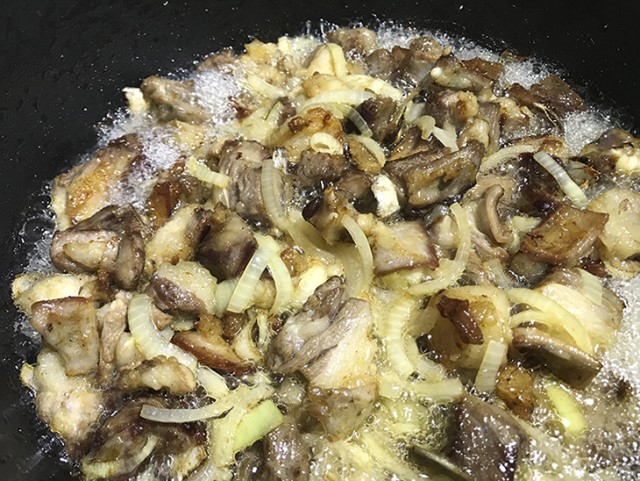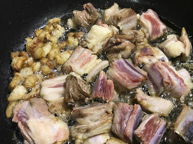 Жир обжарился и частично растопился, сдвигаем в сторону и забрасываем косточки.