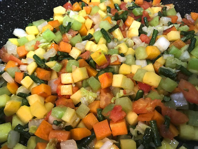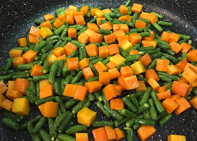 Не поленитесь обжарить овощи в отдельной посуде, на выходе будут целые красивые кусочки. Половины столовой ложки вытопленного жира будет достаточно. Джандо и морковь пошли.