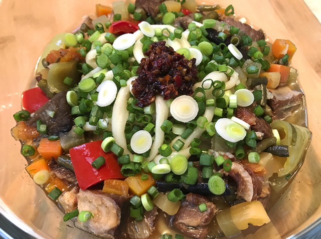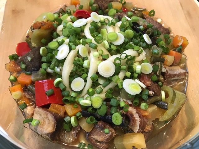 Заливаем ваджой. Сверху зеленые лук и чеснок. Чего-то не хватает?