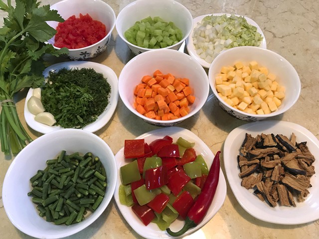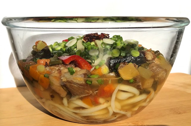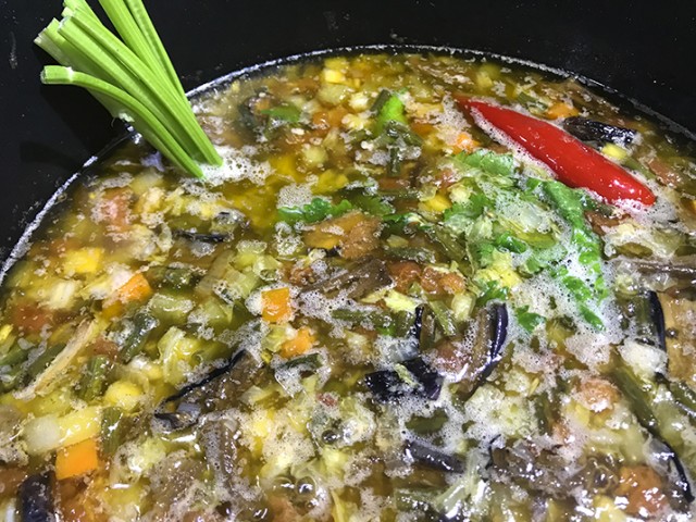 Когда мясо стало мягким и «слезает с кости», добавляем обжаренные овощи, заливаем кипятком, солим, кладем «букет» сельдерея и даем закипеть на маленьком огне, минут пять будет достаточно. Затем выдавливаем чеснок, добавляем нарезанную зелень и обжаренный болгарский перец, выключаем нагрев, закрываем крышкой.