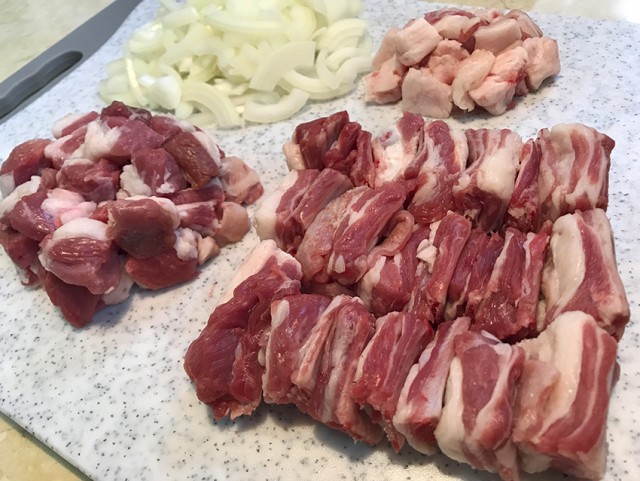 Дальше мясо нужно подготовить. Жир срезаем отдельно, мякоть отдельно, сами ребрышки «в мясе» аккуратно рубим на мелкие кусочки, сантиметра по 3. В таком размере удобно есть, да и смотрится эстетичнее. Нарубить нужно чтобы «края» остались ровными, без сколов. Хрен бы с вами, если маленький кусочек кости, потом сломает ваш последний зуб, а вот если попадет ребенку, это плохо.