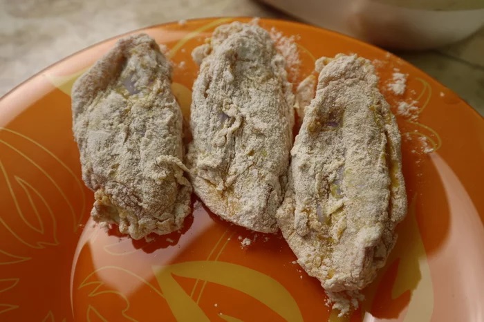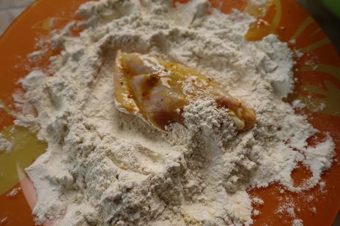 Обмакиваем курицу в яичной смеси, потом бросаем в муку и даём ей полежать 3-5 минут, чтобы мука плотнее прилипла к мясу. Не рекомендую мочить руки в яичной смеси, а использовать вместо этого вилку, иначе яйца и мука прилипнут на ваши руки, а не к курице.