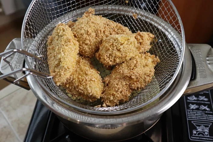 Разогреваем масло. У меня была кастрюля с фритюрницей и ушло примерно 300-400 мл. масла, у вас может быть по другому. Если у вас сковорода, то залить её полностью маслом будет проблематично и дороговато. Думаю можно попробовать обжарить курицу в масле, переворачивая её.