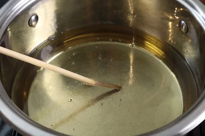 Проверить температуру масла можно деревянной ложкой, лопаткой или китайской палочкой для суши. Если опустив в масло деревянную лопатку она начинает пузырить, то масло хорошо разогрето, если над маслом появился дымок - перегрели, убавляйте огонь. Опускаем курицу в масло, повторюсь - я использовал фритюр.