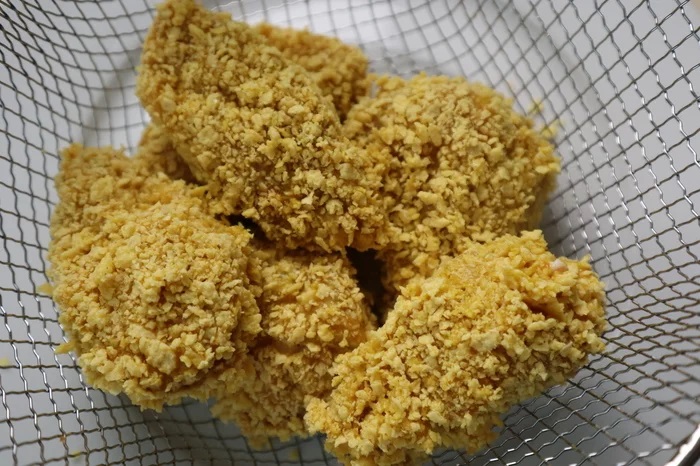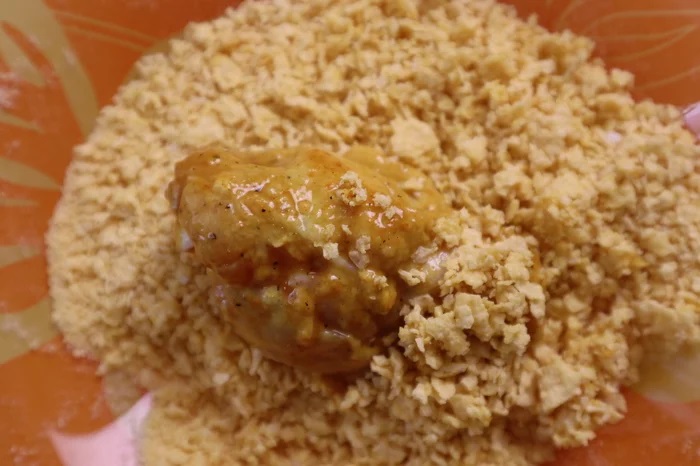 3-5 минут прошло - обмакиваем курицу опять в яичной смеси, потом в кукурузную крошку из хлопьев. Ждём ещё 3-5 минут. Так мы даём второму слою панировки загустеть на курице. Если жарить сразу - есть вероятность, что панировка отвалится от курицы. Есть много способов сделать её прочнее и это один из них.