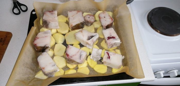 укладываем треску , режем как удобно будет вам их употреблять (я брал готовые уже стейки ) почему то фото не перевернулось