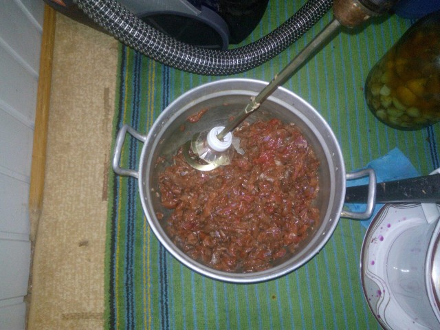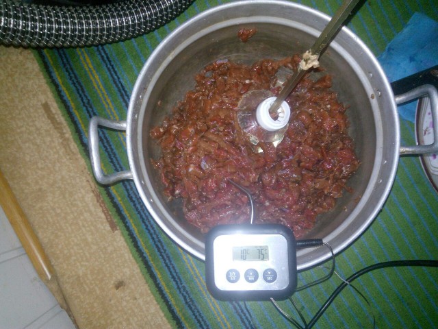 Следим за температурой. Нам нельзя превысить 12 градусов. Это максимальная температура при которой образуются связи (нити) в колбасном фарше, если повышется - срочно в морозилку и потом опять месить