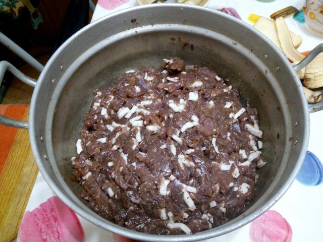 Когда хорошо вымесили добавляем специи, вымешиваем еще и добавляем охлажденное сало