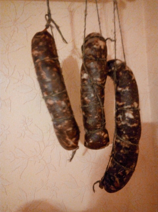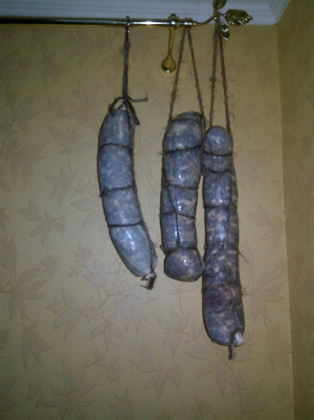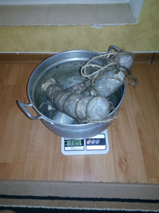 Заказ выполнен.Из трех палочек более килограмма каждая осталось по 600 в каждой. Процент усыхания даже считать не хочется. Себе оставил пол палочки на пробу. Вчера ушла под вискарик. По вкусу отличается от "Московской". В который раз убеждаюсь, что на колбасу очень сильно влияет калибр.