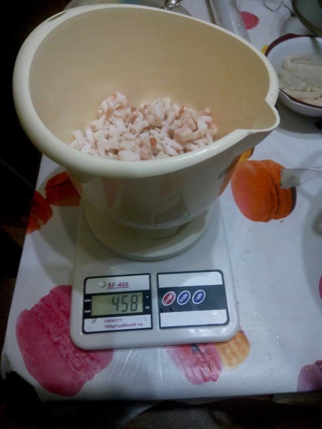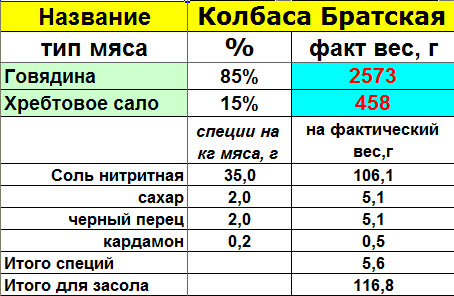 Считаем специи. Мясо после нарезки "похудело" на пленки и обрезки. Они нам не нужны