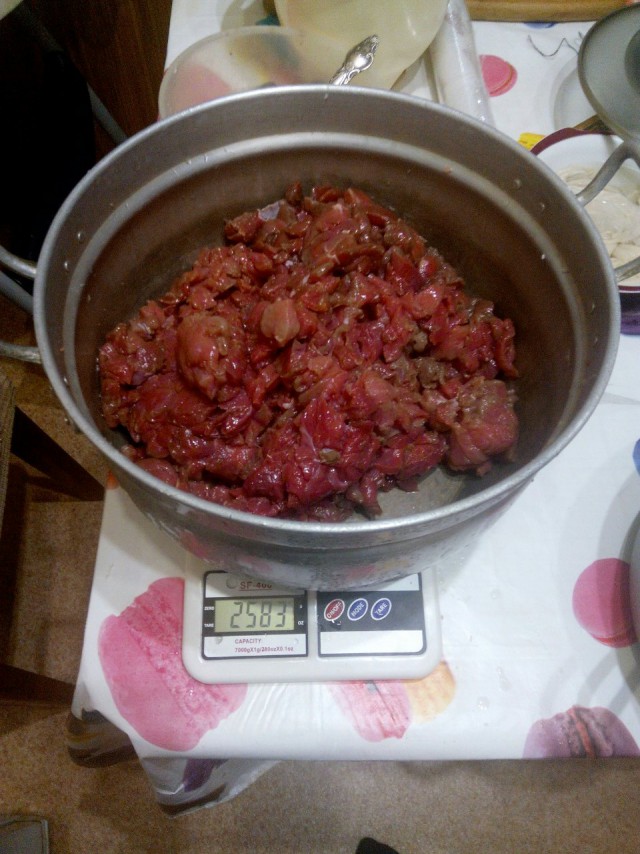 Набиваем обычной мясорубкой через обычную насадку в говяжью синюгу и большие говяжьи круга. Взвешиваем для истории