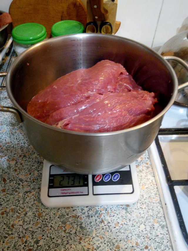 Нарезаем мясо на кусочки по 300-400 грам и отправляем на предпосол в 3% соли от количества мяса на сутки в холодильник. После предпосола нарезаем на мелкие кусочки
