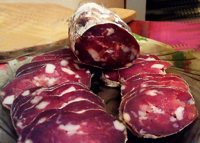 Займемся пока салом. Подморозим и нарежим на кубики диаметром 0,5см или шариками со стороной 0,5 :) заливаем кипятком и ошпариваем пару минут для того, чтобы сало в колбасе было кусочками. Охлаждаем