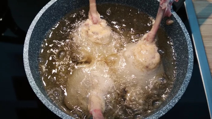 И сразу же выкладываем в горячее масло. Температура должна быть средней, чтобы курица прожарилась, а кляр не сгорел.
