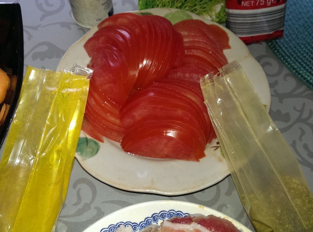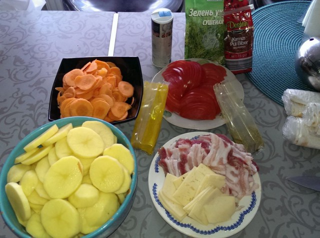 Все нарезаем – картошку и моркошку кружками, картоху 4-5 мм толщиной, морковку кромсал на терке, можно и ножиком, но муторноПомидорки резал на половинки и потом кромсал толщиной примерно 3 мм, с луком поступил аналогично.
