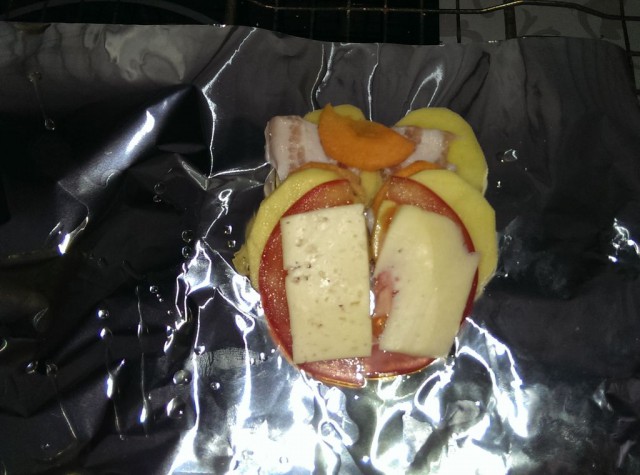И начинаем все выкладывать слоями – картошка, сало, морковка, картошка, помидорка, сырок. Порядок абсолютно не принципиален, но начинаю и заканчиваю кружками картошки.