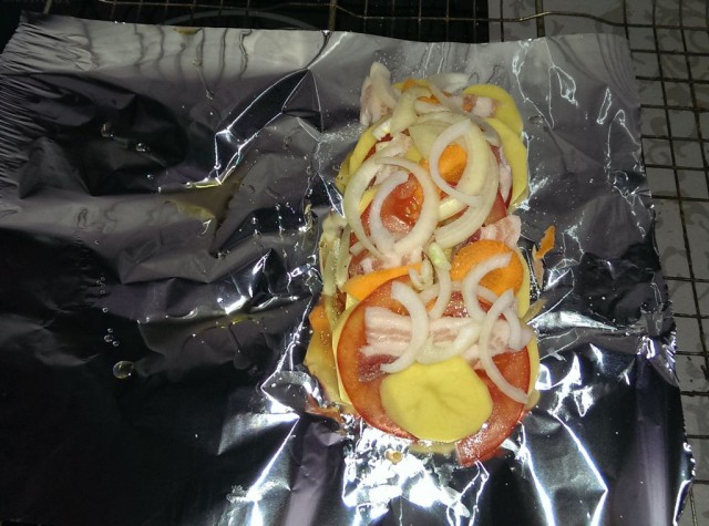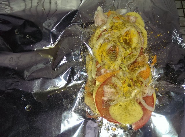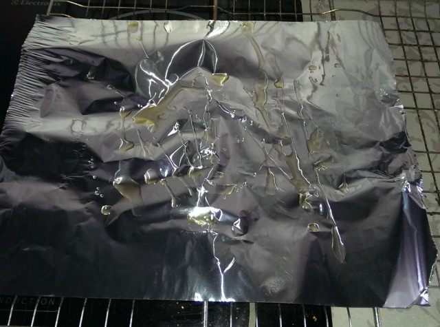 Все, подготовительный этап к фольгированию закончен.Фольги отрываю где-то 40-45 см и укладываю в решетку для гриля блестящей стороной вверх. Так получается очень удобно, т.к. в середине у решетки есть удобная выемка, как раз в ширину укладки ингредиентов. Слегка смазываю оливковым маслицем.