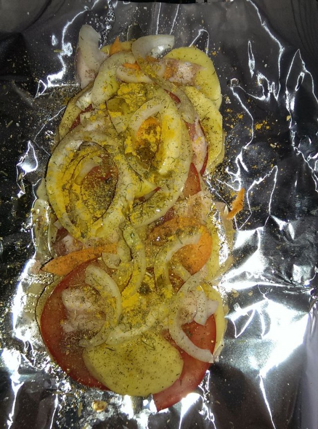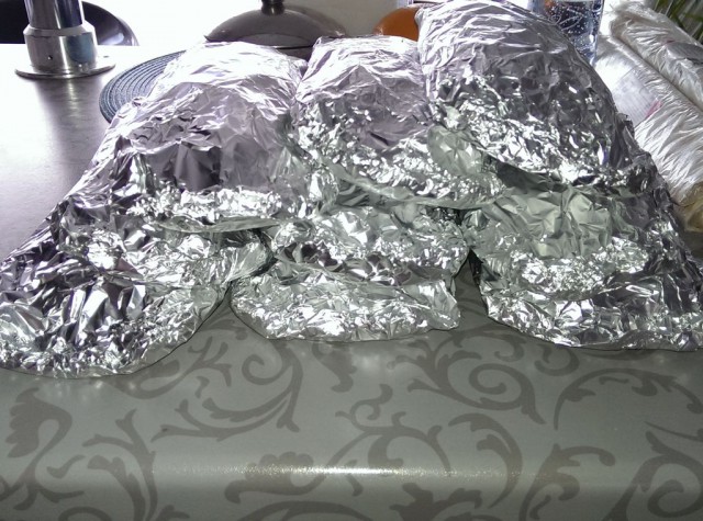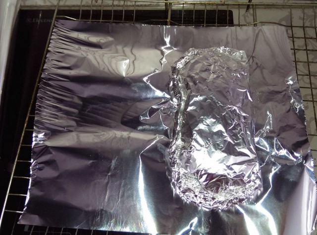 Закрываем второй половиной фольги и загибаем края, стараясь не порвать фольгу, но закрутить их как можно плотнее и оставив как можно меньше воздушного пространства под фольгой. Поворачиваем (не переворачиваем!) на 180 градусов и кладем на второй слой фольги, тоже блестящей стороной наверх. Заворачиваем так же как и первый слой. С третьим слоем фольги делаем тоже самое. Я заворачиваю в три слоя, чтобы не подгорало.