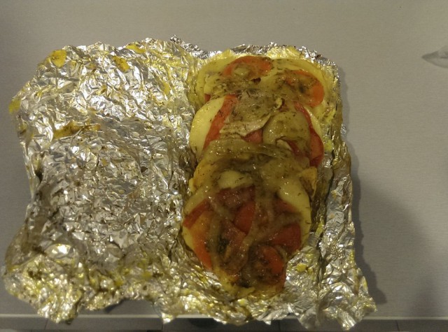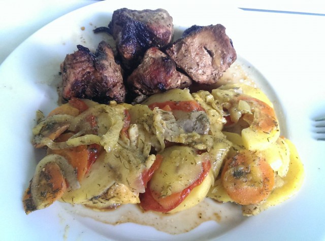 После снятия с решетки уложил все готовое на противень и укутал в кучу полотенец, дав картохе «дойти» еще минут 10-15То, что получилось сразу сфотографировать не удалось, т.к. ингредиент №10 (хорошая компания) отвлек от сего процесса и запечатлел только одну оставшуюся порцию уже только на следующий день. С шашлыком выходит просто замечательно и очень сытно.