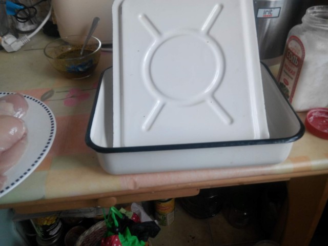 Берем посудину под засолку. в данном случае какая-то эмалированная ёмкость годов так этак 80хх. Запомните как вы мясо положите - такой формы оно и будет. Распрямить его почти нереально.