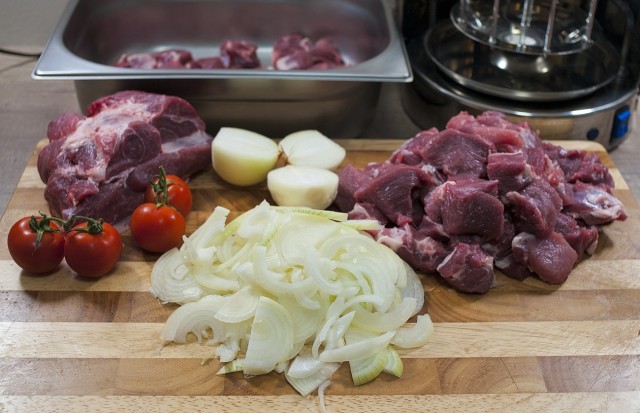 Мясо нужно порезать и так, чтобы кубики соответствовали пропорциям шампуров, машины, да и всему