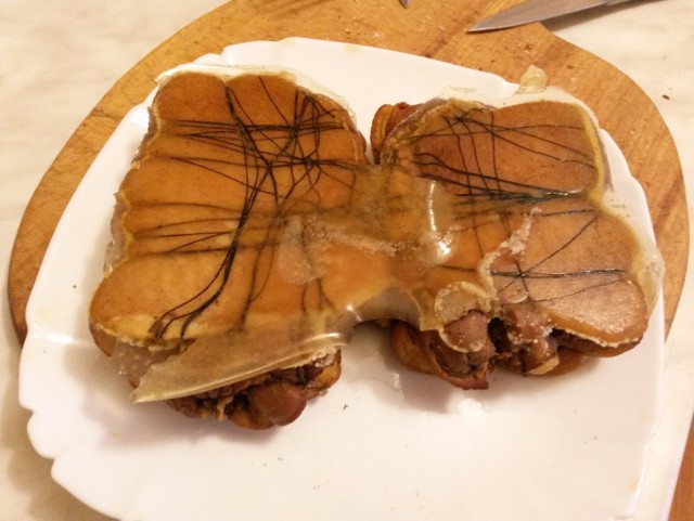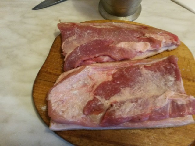 Мясо тщательно промываем,шкуру скоблим и режем на две части.