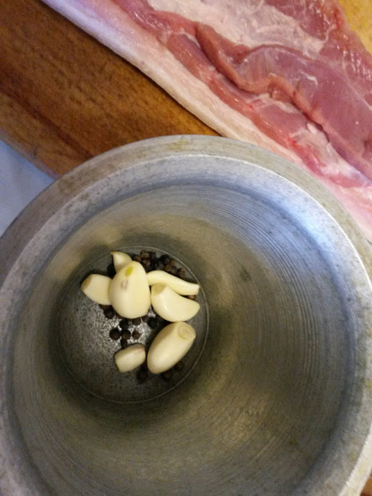 Берем ступку и отправляем в нее перец горошком,чеснок и соль и перетираем эту смесь)