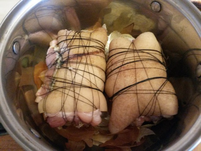 Укладываем на дно кастрюли шелуху от пяти луковиц и рулеты