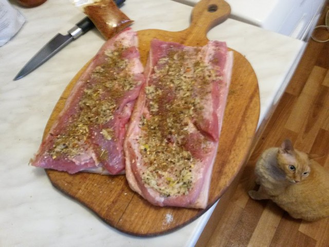 Полученную смесь наносим на куски со стороны мяса..Кот попал случайно)