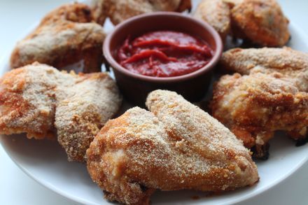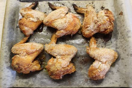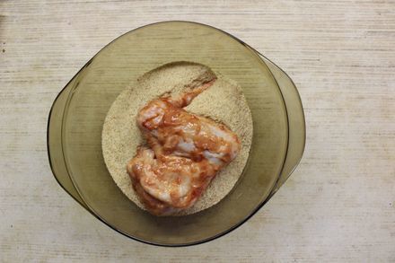 Достать замаринованные крылышки и хорошенько обвалять в панировочных сухарях.