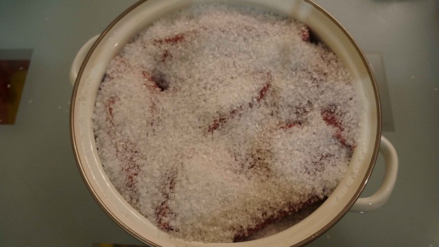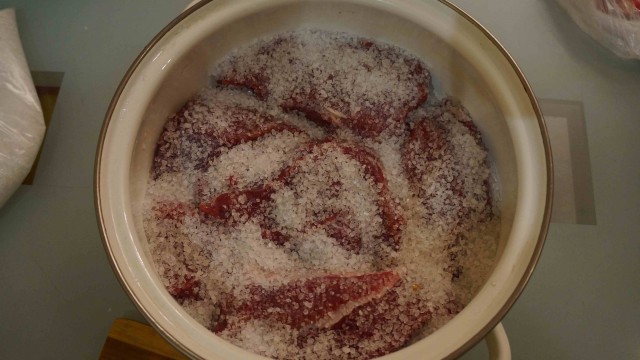Ставлю в теплом месте под пресс, ровно на сутки. Делаю вечером обычно, с утра там будет куча сока. Сливаю его, а вечером очищаю от соли просто соскребая ножом. В разных рецептах читал, типа надо солить чуть ли не неделю, потом по 2-3 дня отмачивать. Я ленивый. По такому рецепту уже раз 5 делал и все съедается на ур