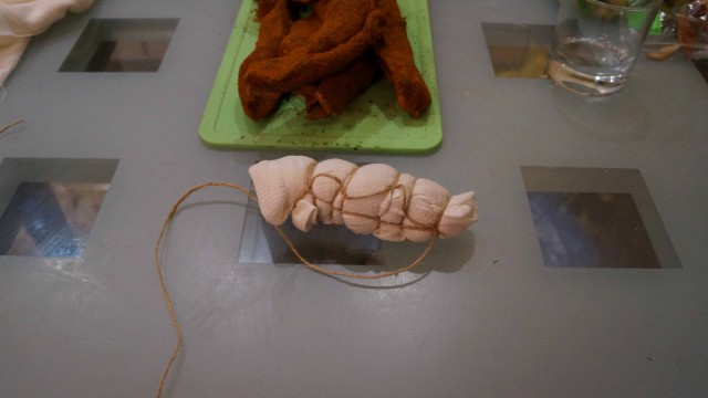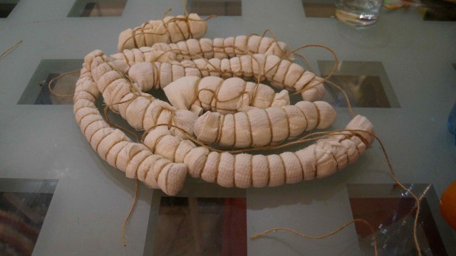 У меня тамбур на 3 квартиры, там у каждого стоит по ящику, типа под овощи, я там храню вино домашнее и сэм. сделан специально с щелями....вот туда и отправляется все это в подвешенном состоянии.....через неделю начинаю пробовать....в идеале 10-14 дней, в зависимости от того какой твердости хочется.....что не успел съесть можно убрать в холодильник в целлофановом пакете будет храниться 3-4 месяца спокойно... только столько времени не разу еще не продержалось у меня.