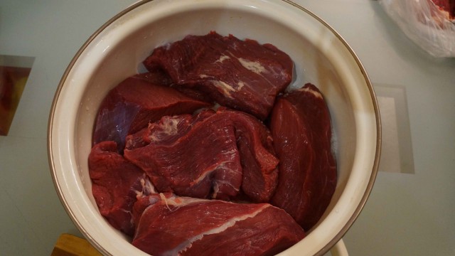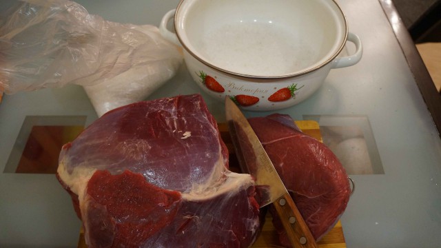 И так, на первом этапе нам понадобиться мясо, предпочтительно говядина. У меня 3 кг. Соль крупного помола, без всяких добавок. Эмалированная кастрюля, и острый нож.