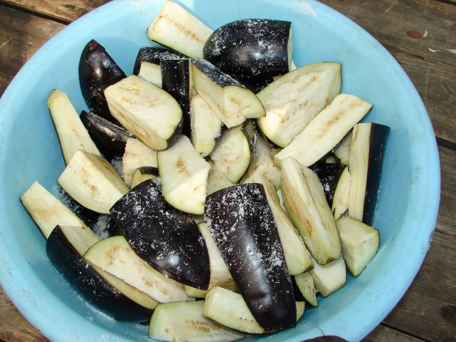 Первым делом пересыпаем баклажаны солью, чтобы вышла горечь. Режем всё крупно.