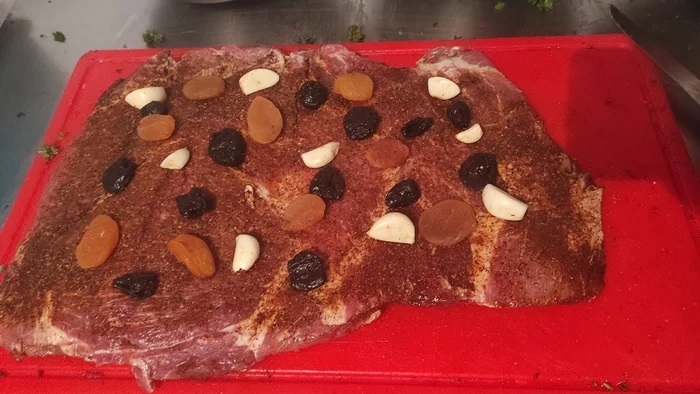 Кусок шеи разрезать что бы получился пласт. Натереть приправами с двух сторон. Выложить сухофрукты, чеснок и посыпать нарезанной петрушкой.