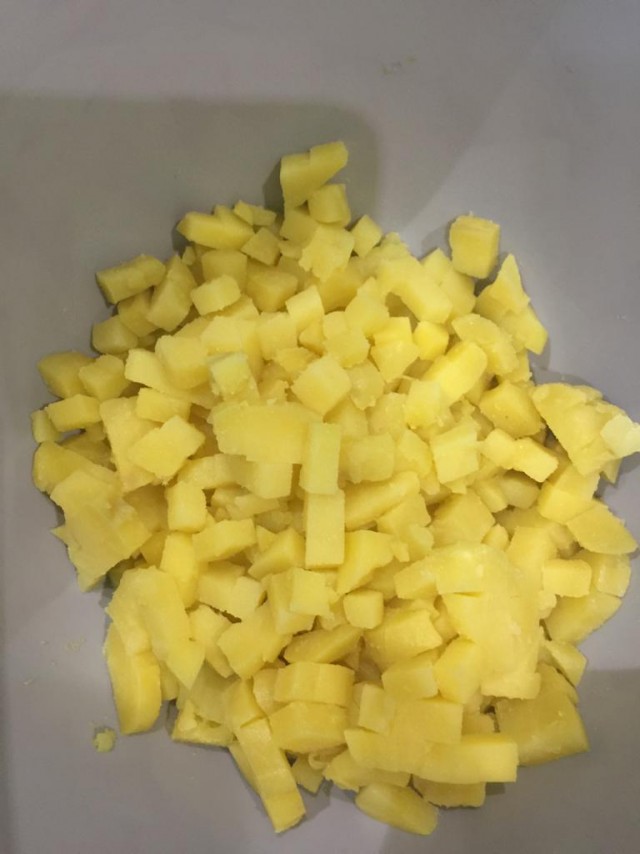 Отвариваем картошку в мундире и яйца вкрутую и начинаем нарезать. Сначала картошку