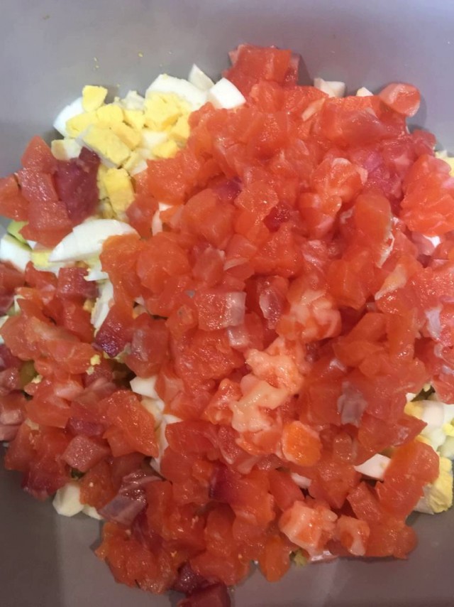 Попался мне когда то в интернете интересный и простой рецепт необычного салата, попробовали с супругой очень понравился, дети тоже заценили. Делается быстро, легко, да и не так дорого с учётом новогодних скидок на малосольную рыбку.