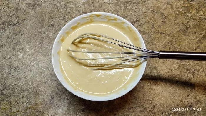 В тарелку с соком от тунца добавляем 3 ложки майонеза, и муку.Размешиваем венчиком до однородной массы