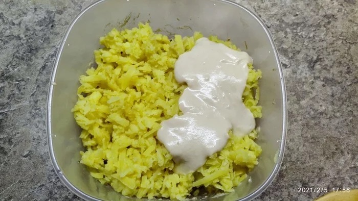 3 ложки соуса на первый слой из тунца, перемешиваем.Выкладываем натертый картофель + 3 ложки соуса, размазываем.