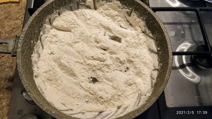 Берем сухую сковороду, выкладываем 3 столовые ложки муки, обжариваем на среднем огне, помешивая, до кремового цвета (один из признаков готовности будет ореховый аромат).