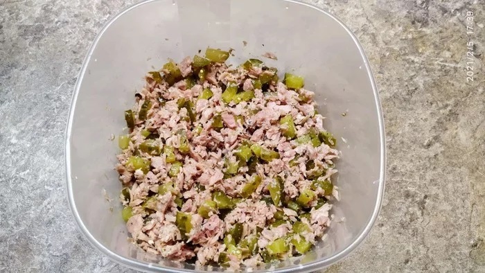 Открываем банки с тунцом, разделяем сок и тунец по разным тарелкам.Нарезаем маринованные огурцы, разминаем тунец, перчим черным перцем перемешиваем.