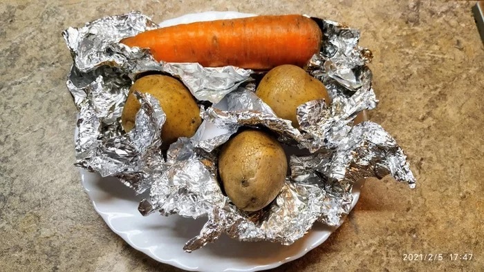 Тщательно моем картофель и морковь, заворачиваем в фольгу, ставим в духовку на 90 минут при 200С. После достаем и разворачиваем из фольги.